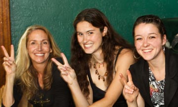 L-R Gail Swanson, Elaine Ryan and Sebrina Barron flash peace signs on demand for Play it Forward. Photo by Joyce Chin